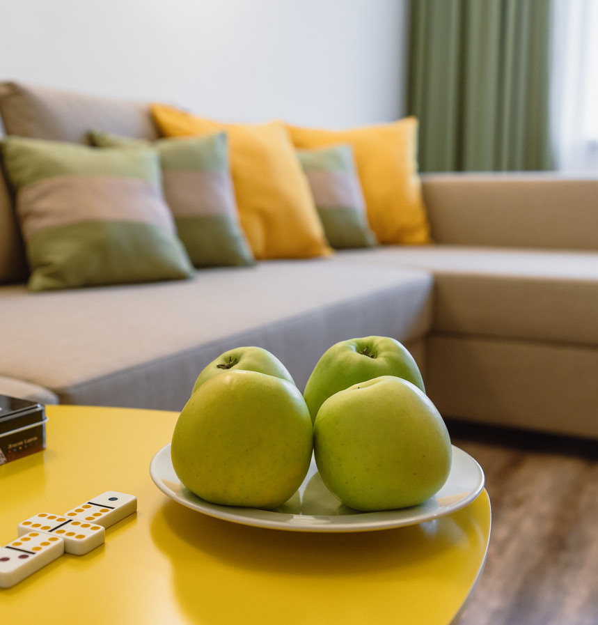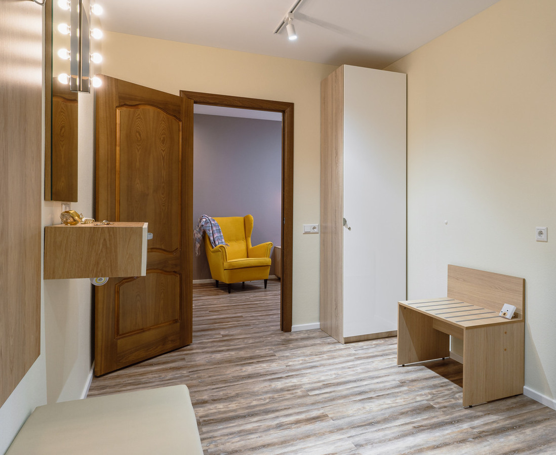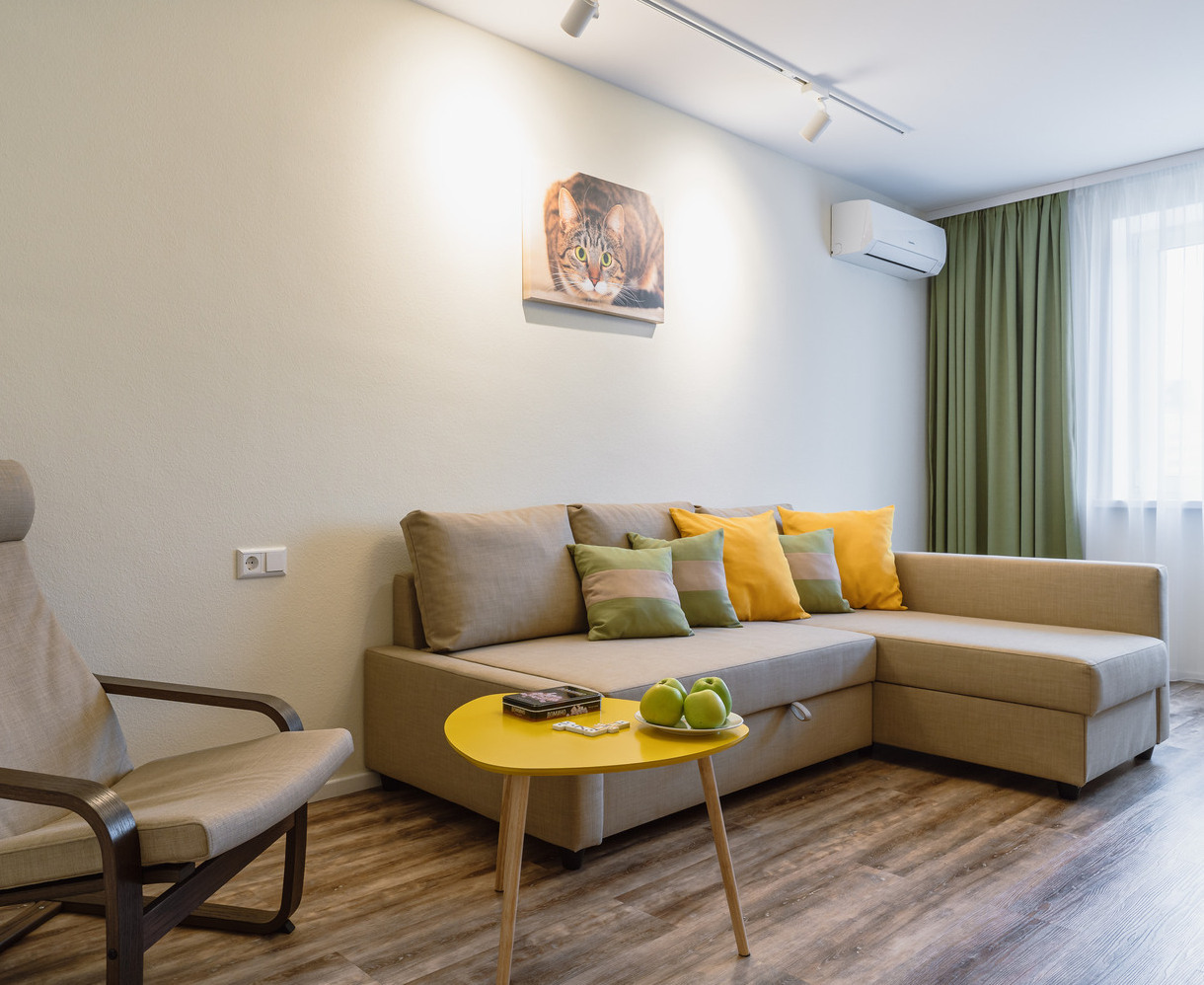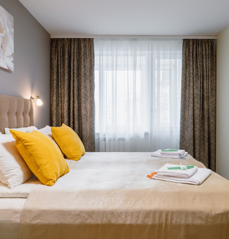 Двух-комнатная квартира включают кухню, гостиную, спальню, ванную комнату и туалет. В гостиной: раскладной диван, кресло, стул, письменный стол, журнальный столик. В спальне: большая двуспальная кровать с возможностью разделить на две односпальные кровати. Одно дополнительное спальное место на раскладной кровати (итого по спальным местам 4 основных базовый тариф и 1 дополнительное + 500 руб сутки)